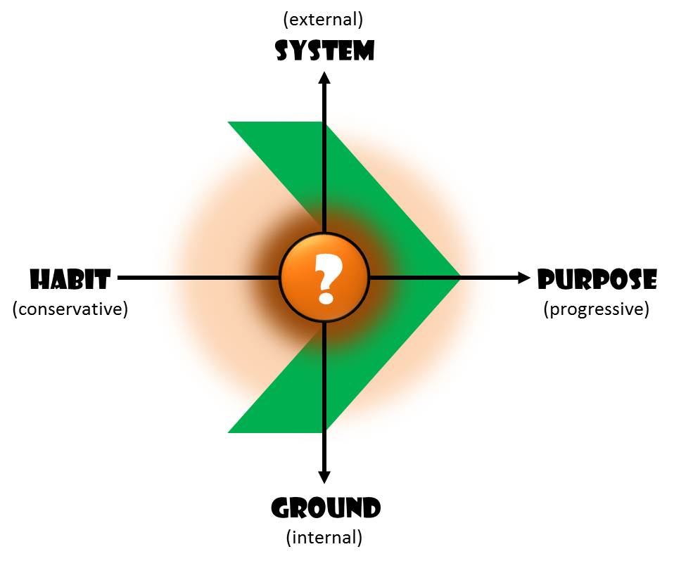 As we shift attention to the horizontal axis, we move to the left (in the Quadratic) where we are confronted with the power of HABIT. This refers to the routines and patterns that persist through time, somewhere along the sliding continuum into unconscious, reflexive, automatic and compulsive activity. By definition habit is conservative, keeping routines (including assumptions, preferences, and behavioral responses) that have been “working” to some extent. This so-called success of a routine might actually interfere with the individual’s personal achievement or pursuit of happiness, but still be conserved for its value in coping with stress.