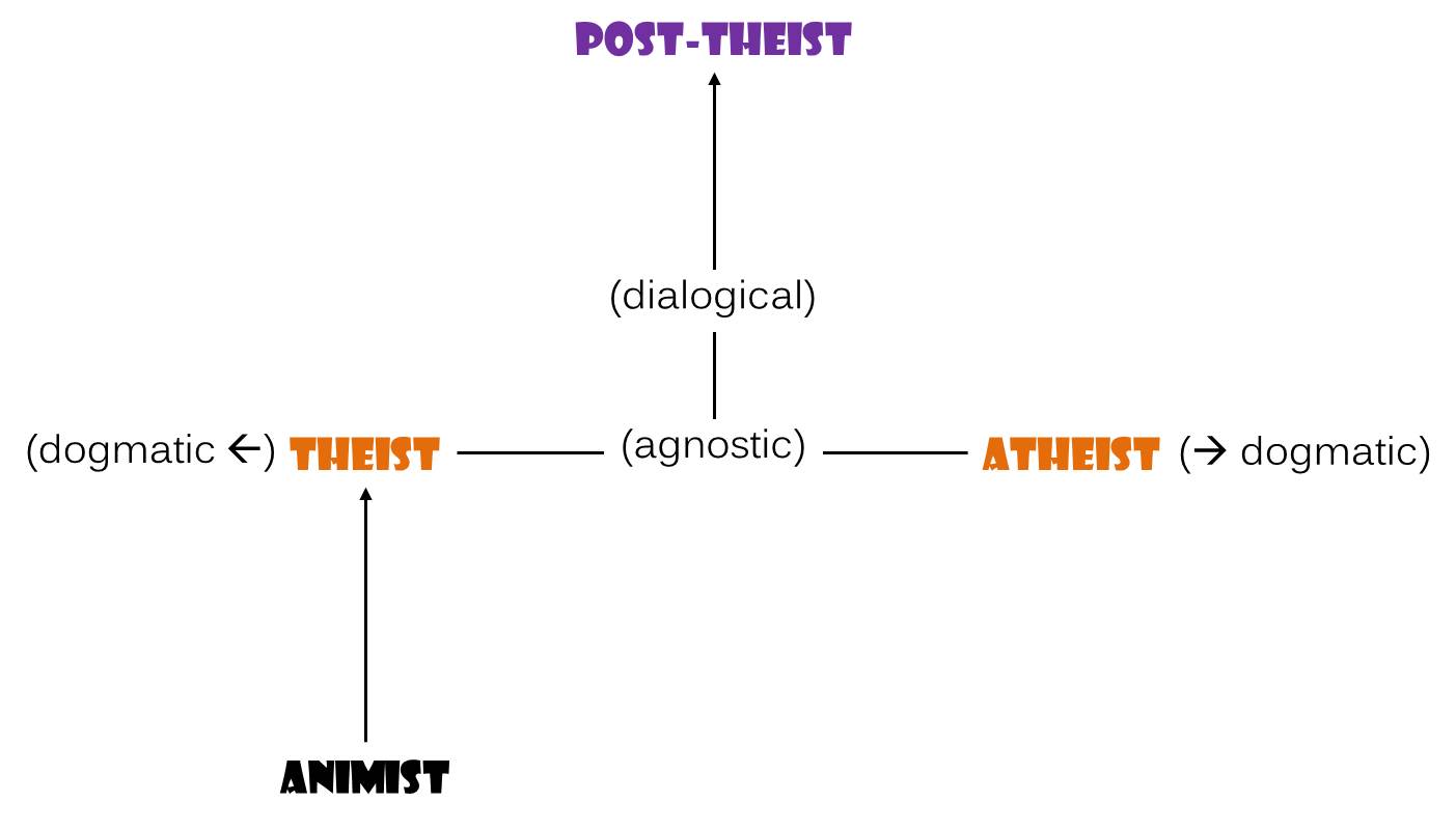 The progress of religion towards post-theism has its critics on either side, with devoted theists decrying it as just another form of atheism, and atheists voicing their suspicion that it’s taking us backwards into superstition and tribalism when we need to be moving forward into the enlightenment of science and technology. Theists are sure that the “post” in post-theism is motivated out of a desire to get rid of god, to get past our need for what god represents and provides. On the other side, atheists hear “theism” in post-theism and are convinced that it’s nothing more than a postmodern reconstruction of the same old neurosis.