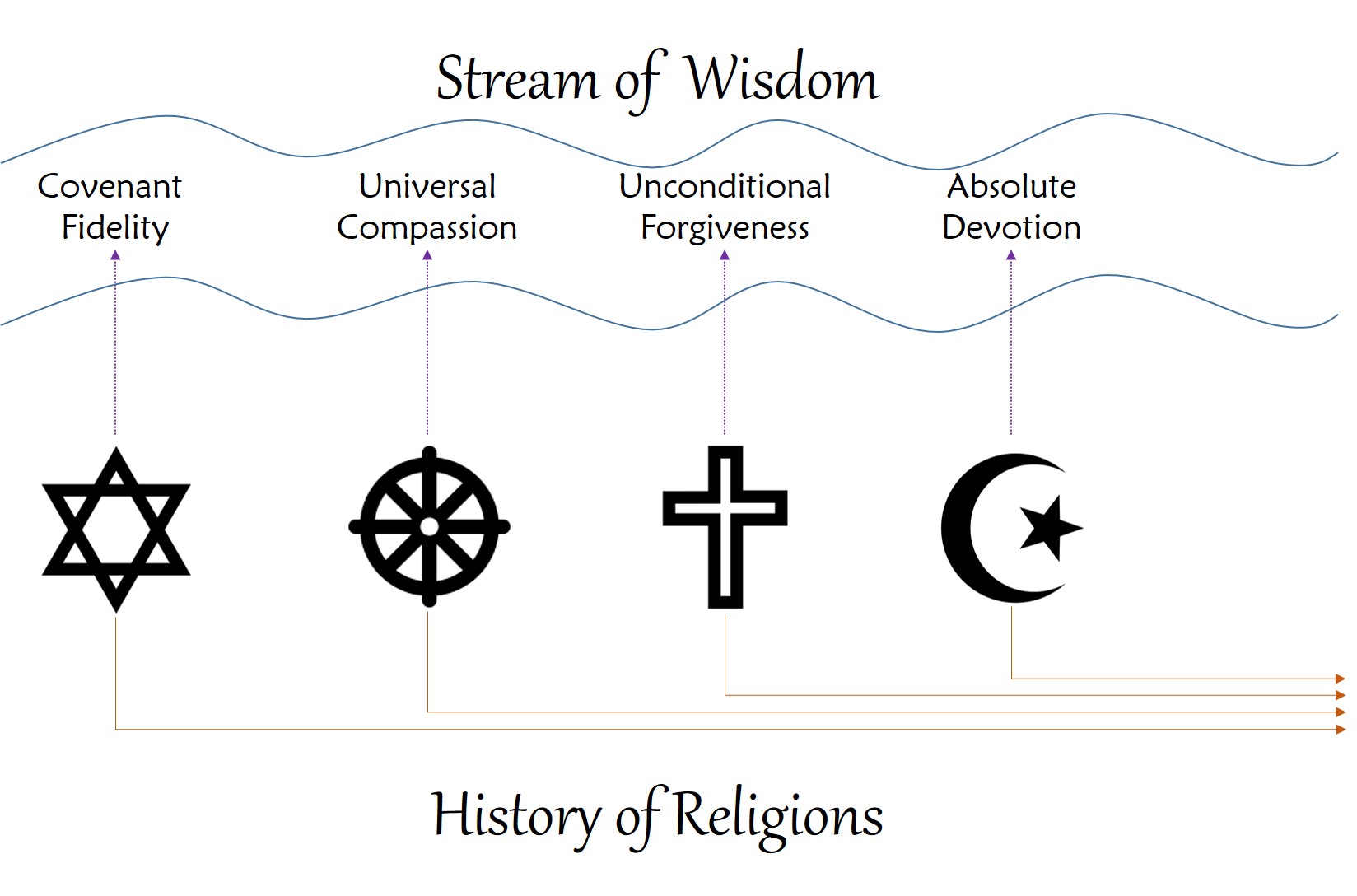 Once an insight was gained or a principle introduced, its transforming power didn’t always, if ever, meet with unanimous acceptance. This is where it is helpful to distinguish between the historical religions (including the history of religion) and the stream of higher wisdom that has been progressing over the millenniums. Think of it this way: as religions evolved, new ethical insights and mystical realizations were “uploaded” to a collective depository of higher consciousness that transcends each and all local cultures. Every time these insights and realizations are contemplated, taught, shared, and put into practice, that wisdom is “downloaded.” The religions exist in local time and get closer or fall farther away from these truths depending on the political intrigues, moral campaigns, or economic hardships that happen to be tying up energy. The stream of wisdom, however, is timeless.