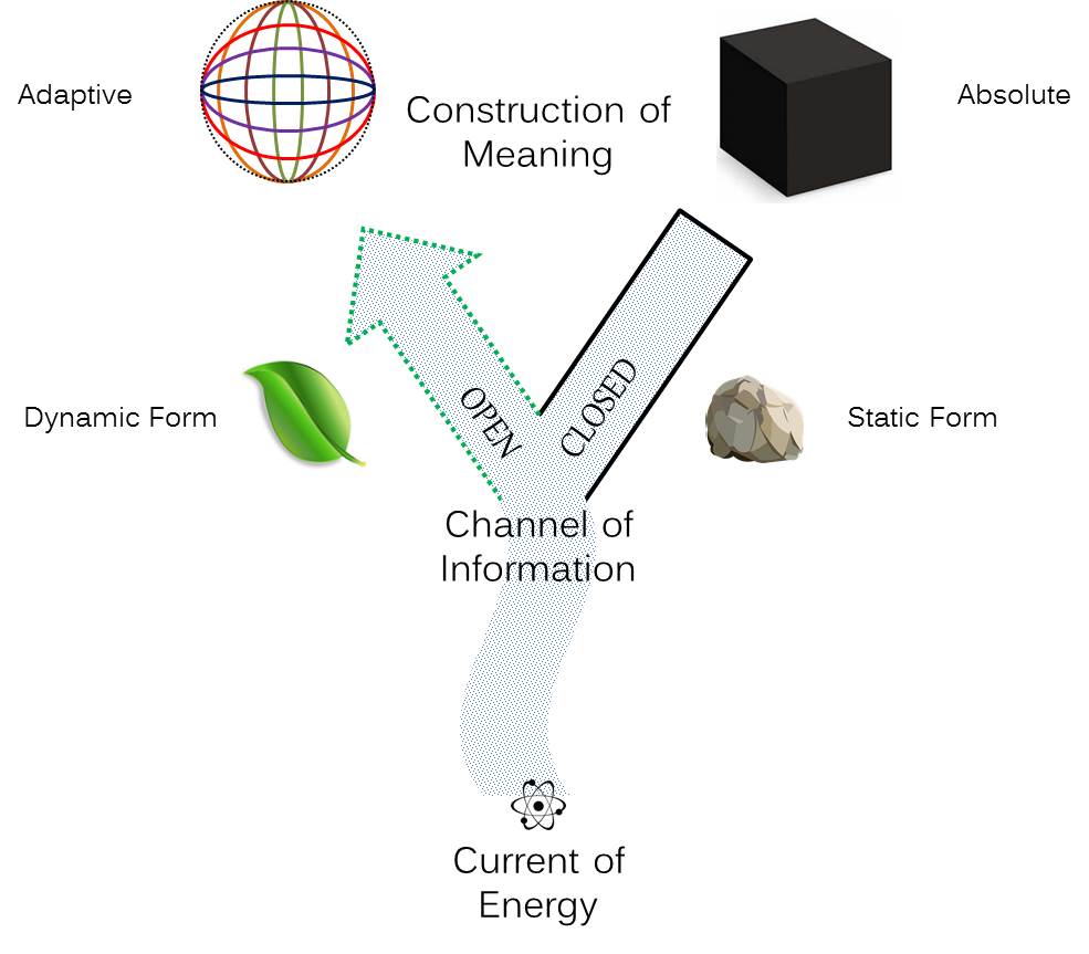 Open channels are dynamic and exemplified in all living systems, like your body. Conversely, closed channels are static: they keep their form constant until either more energy surges into them than they can hold and they burst apart, or their internal energy bonds weaken and they crumble into more stable states (a process known as entropy, or the Second Law of thermodynamics).