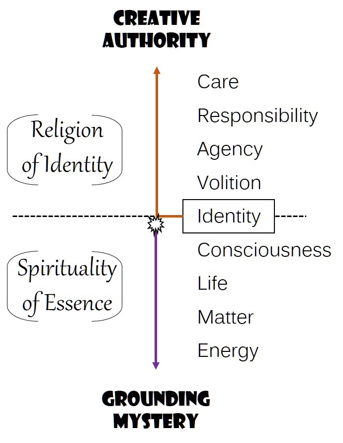 Moving up my list from identity, we don’t release ego but rather assume it in all that follows. This is where religion comes into play. Our connections outward into daily life and relationships are necessarily personal, which is to say they involve who we are in the world (as distinct from what we are). Ultimately our individual development into maturity means that we start choosing (or willing, volition) the life we want, enacting our intentions (agency), taking responsibility in what happens, and fully investing ourselves in the process (care). This outward flow from identity to care is what I mean by ‘creative authority’.