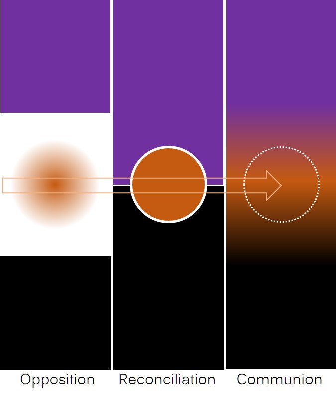 In my diagram, the distinct and separate ego has reached the point in its development where ‘me and mine’ no longer limit a fuller vision of reality. While a sense of oneself as a person continues to be in the picture, the sharp division of body (black) and soul (purple) gives way to a blended continuum of animal and spiritual life. We are ‘spiritual animals’ after all, and now our awareness and agency as persons can move us into a new but still self-conscious mode of being. My name for this mode of being is communion, literally ‘together as one’. There is no god on one side and the world on another. No souls separate from bodies awaiting deliverance to a postmortem paradise. No ‘us’ on one side and ‘them’ on the other.
