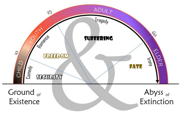 Northup Frye’s four literary types are also included in my diagram, each one corresponding to an Age and its driving concern. Comedy is the up-swing to ‘happily ever after’. Romance follows the heroic quest for an ideal. Tragedy descends the plunge-line of misfortune. Irony provides a double-vision between what is said at the surface and what is meant underneath. Our personal myth will predictably move through these distinct narrative frames, forcing us to adapt our construction of meaning to the shifting focus of our life in time. Although many have tried, any attempt to impose a frame of comedy over the reality of suffering only ends up forfeiting a potentially life-changing insight behind a veil of denial and make-believe. Needless to say, otherworldly religion is especially good at this.