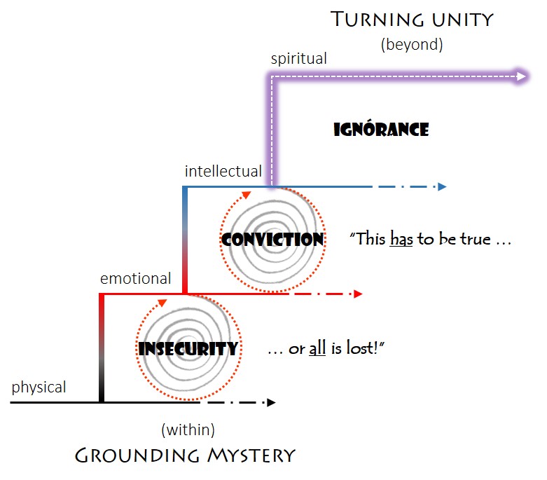 The above diagram depicts an in-turning spiral between the physical nervous system and our emotional intelligence, sucking the psychic energy of consciousness off its intended upward path and into a strangling vortex of insecurity. In some cases the anxiety can be so intense that we are sure our extinction is imminent. But most of us are just insecure enough to work hard at keeping our attachments close by.