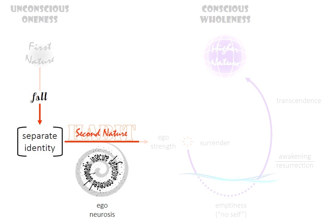 For this to happen we must surrender our center of personal identity (aka ego or second nature) and go beyond ourselves – not negate, renounce, or cancel out the ego, but rather to leap from its stable base into a conscious wholeness where body and soul, self and other, human and nature are affirmed in their unity. The stability of this base is a key precondition of our self-transcendence, for without it the thrust of our leap will only push our feet deeper into the muck of ego neurosis.