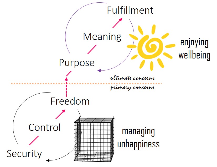 The short dotted arrow extending vertically from primary concerns to ultimate concerns indicates that while the process of development would normally cross this threshold, many of us choose to stay inside the bars. True enough, we probably don’t see this as a choice we’re making but simply as the way things are.