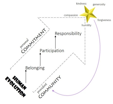 My diagram gives an illustration of this laddering dynamic. Again, a provident community instills in the newborn and young child a deep sense that she belongs. As she matures, the youngster is encouraged to participate in the community as a contributing member. And eventually, if all goes well, the young adult will take a responsible role in creating the new reality of an even stronger, more provident community for all.