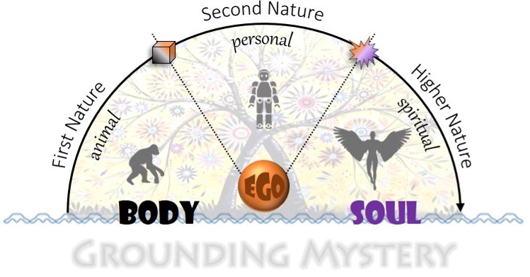 As far as the relative position of the three modes with respect to the grounding mystery is concerned, you’ll notice that both body and soul are in direct contact with it whereas ego is slightly elevated in its own separate space. This makes the point that body and soul together constitute what we are as human beings, while ego is who we (think we) are.