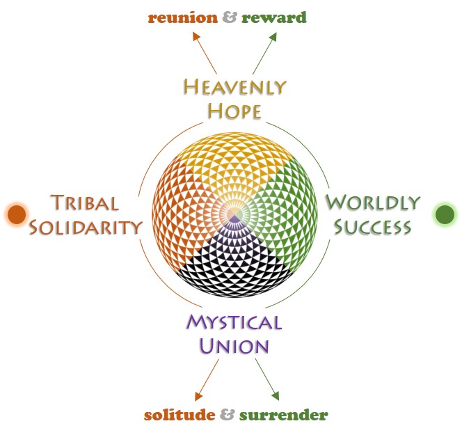 The vertical axis between the aims of heavenly hope and mystical union carries a tension of positive and negative attitudes, respectively, as they relate to the conventional arrangement of those horizontal concerns. On the positive side, heavenly hope anticipates a final reunion (accent on community) with those heroes, saints, and loved ones who departed before us. It also holds the promised reward for our faith, virtue, and sacrifice in this life.