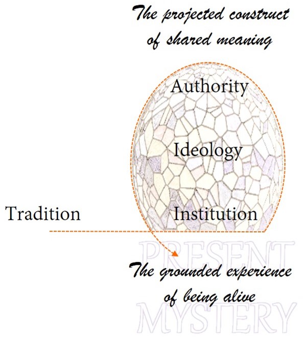 The larger process of culture is dedicated to preserving this projected construct of shared meaning (or world) through the practices of tradition (literally handing on), the structures of institution, and the truth claims of ideology, all under the auspices of some absolute authority which is beyond question or reproach. (For many ancient and present-day societies, this is where god dwells and presides over human affairs.)
