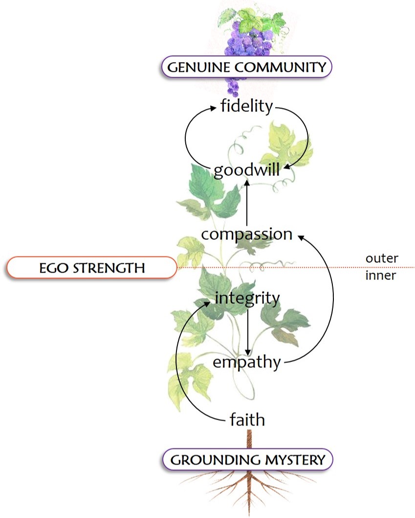 My diagram depicts this scaffolding on the image of a grapevine plant, with its deep roots, outreaching stem and leaves, and the berry cluster announcing its ‘self-actualization’ or, as we might say, its raison d’être (reason for being).