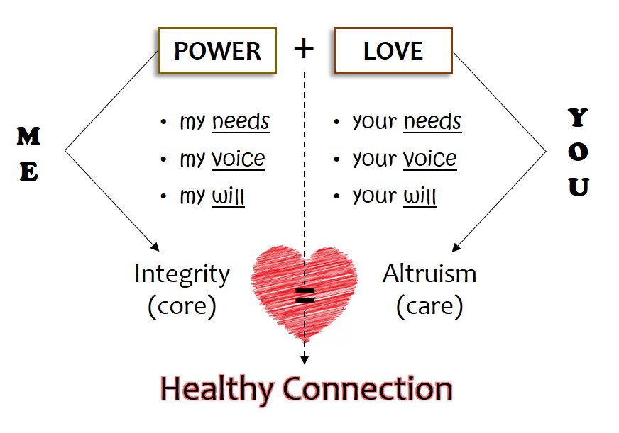 While power is a function of your own integrity, love (as altruism) is opening to your partner as an equal, respecting her needs, listening to his voice, and including his or her will in your shared construction of meaning (or dialogue).