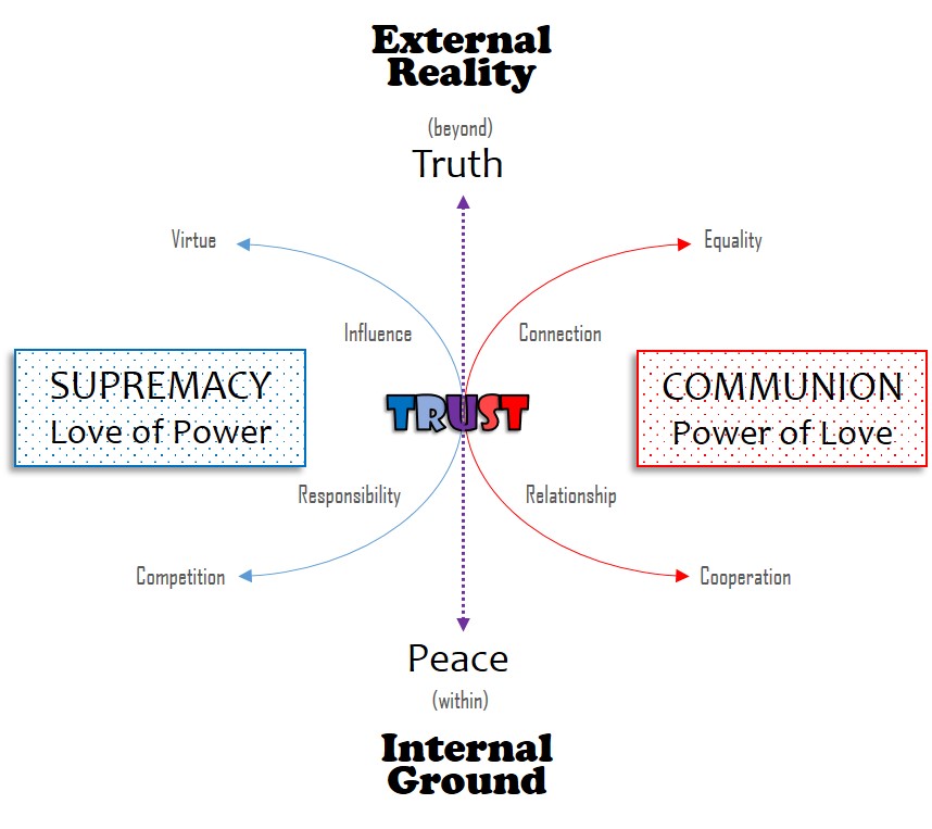 When we honor the dynamic balance of supremacy and communion in our lives we are in a position of trust. From that position we can drop below ego concerns for a deeper peace within, as we are also able to look through our constructs of meaning for the truth of what’s really real.