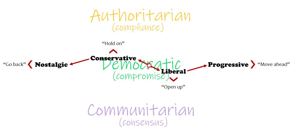 By definition – which is always a good place to start – a Conservative is someone who seeks to conserve or “hold on” to what’s been working so far … or at least was working not too long ago. By defending traditional ways and values, Conservatives also, at times unwittingly but at others with full intent, work to strengthen or restore the establishment of authority from earlier times. For this reason, I have placed an arrow of sympathetic influence from the Conservative voice towards more authoritarian forms of governance, which characterized many or most traditional societies (chiefdoms, monarchies, and empires) of the premodern period.