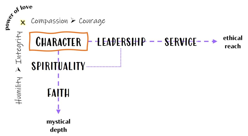 The logic of this model is based in my understanding of faith as the soul of spirituality, and service as the heart of leadership. The general direction of energy is from the leader’s inner life (of faith) to their action in the outer world (as service), which justifies the order of terms in my title: A spirituality of leadership. In what follows, we will explore four character virtues that facilitate this energy flow (or influence) and help us frame out a working definition of leadership.