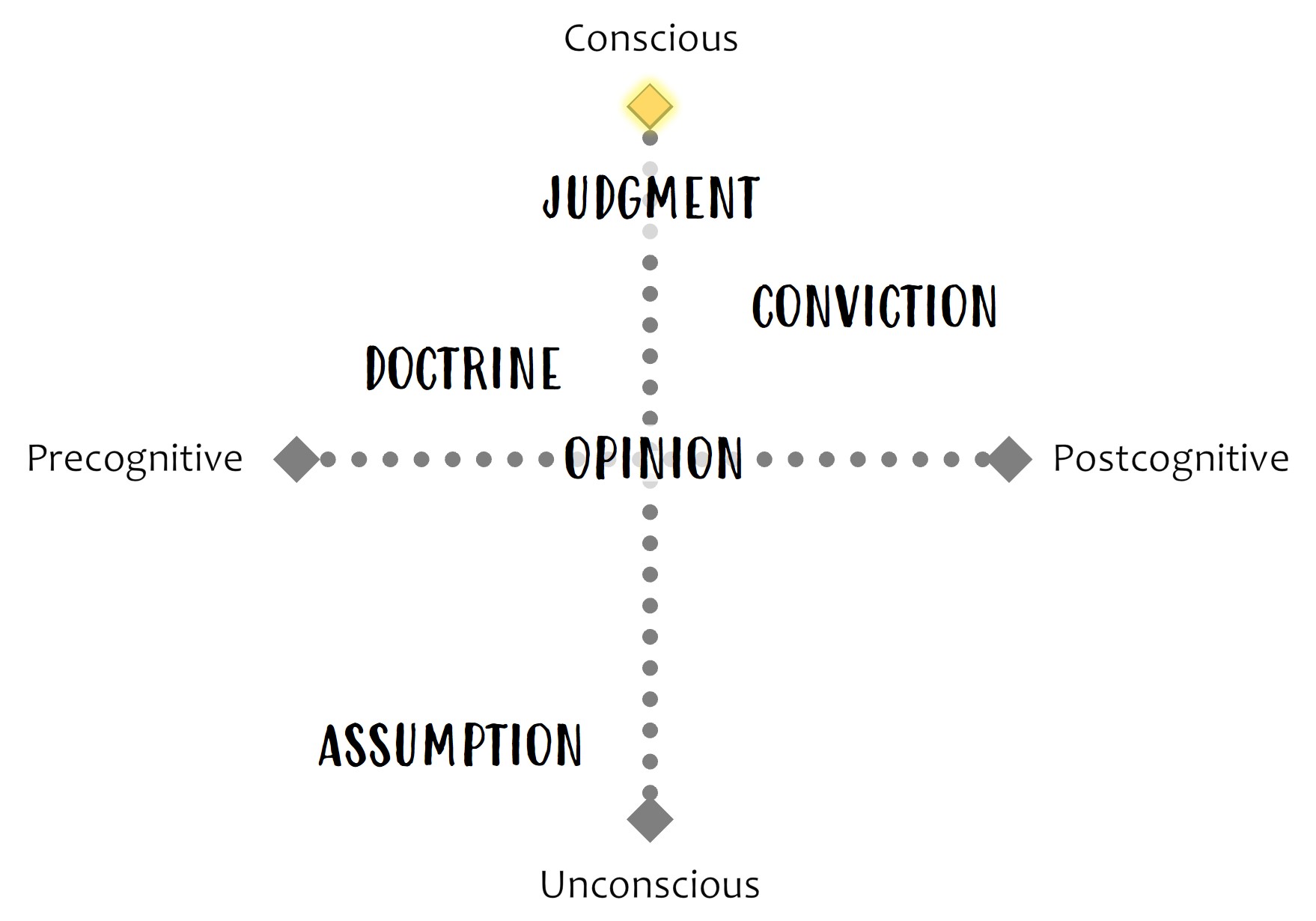 It requires using the full capacity of our conscious cognitive mind. The type of belief that represents our careful consideration, logical analysis, rational assessment, reasonable discretion, creative thinking, responsible discernment, and evidence-based observations is called a judgment. On my chart it is positioned directly above opinion, and can be defined as a well-deliberated opinion on whatever the subject, question, or problem happens to be.