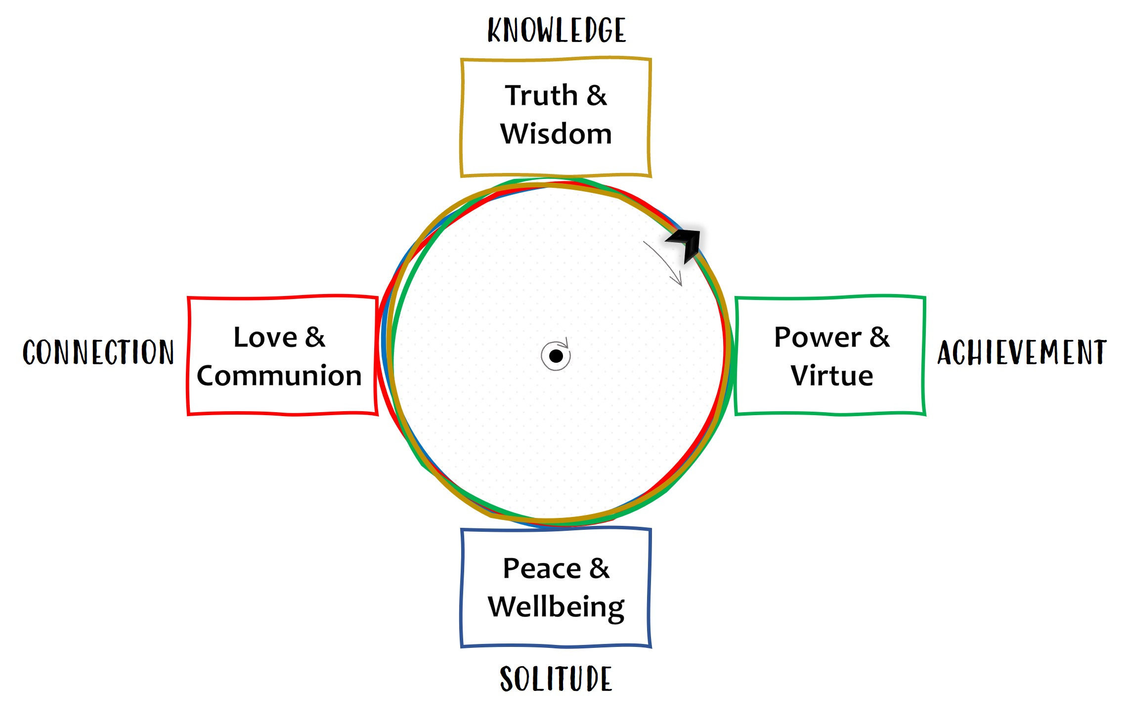 I’ll briefly define the typology of four dimensions and then explain how to play the game. The mechanics of the game involves spinning a wheel that has an arrow fixed to its rim. The wheel itself is a multi-colored braid of four strands corresponding to the four domains. Each domain is labeled with key terms in a frame of its specific color. Terms inside the frame provide a formal definition of what we seek and can expect to find in that dimension of life. A third term outside the frame summarizes the theme in a more straightforward and practical way, clarifying a characteristic action and its aim.
