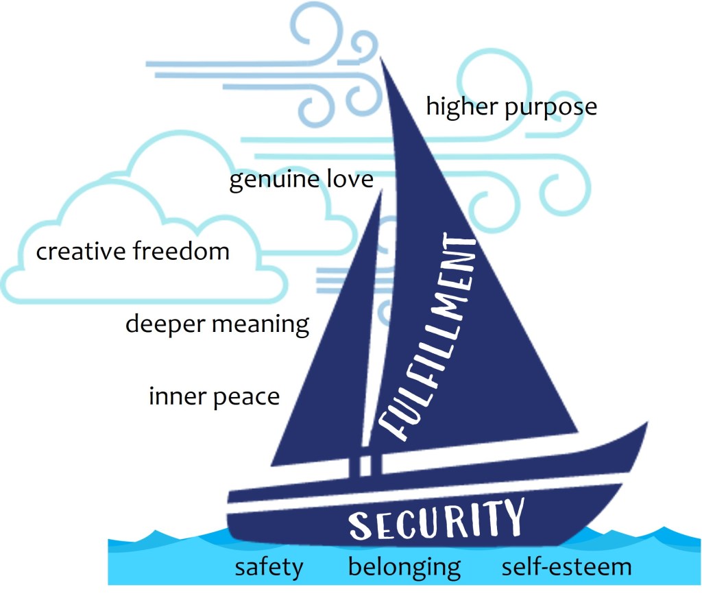 A sail is not designed to displace water but to catch the wind. An entirely different set of values to the security needs down below require your attention now. These values, or ideals, are the Five Aspirations of your human spirit. They inspire and motivate every human being to desire, seek, and strive after fulfillment. Fulfillment is not just another word for “happiness,” but involves reaching full capacity and realizing the full potential of your human nature. Fulfillment.