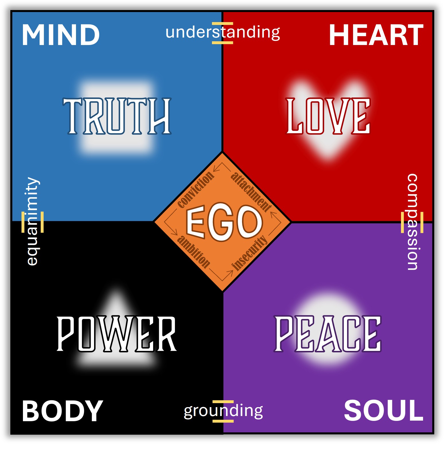 We will leave the more thorough definitions for another time, but in the space that remains let’s turn our attention once more to the graphic illustrating what I will now call “four-square spirituality.” Crossing the boundaries between our four faculties and their respective aspirations are four channels, each of which facilitates the flow of the Human Spirit’s circulatory system.