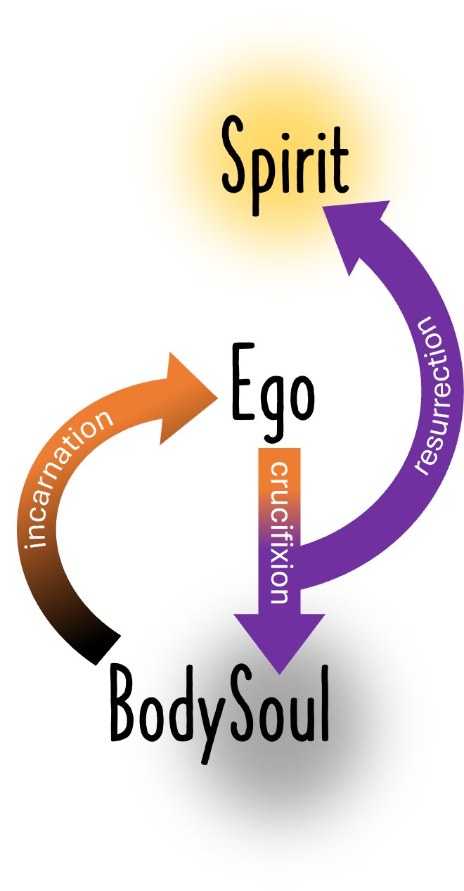 “On the third day,” which is to say, after the surrender of Ego is complete, the newly activated spiritual intelligence rises with a fresh, expansive freedom. Resurrection, rising or being raised up, tracks the path of transformation from the BodySoul to Spirit. Whereas BodySoul is the grounding mystery of our being in deeper oneness, Spirit (from word origins meaning breath or wind) is dynamic, free-range, and communal, lifting awareness into the experience of higher wholeness and genuine community.