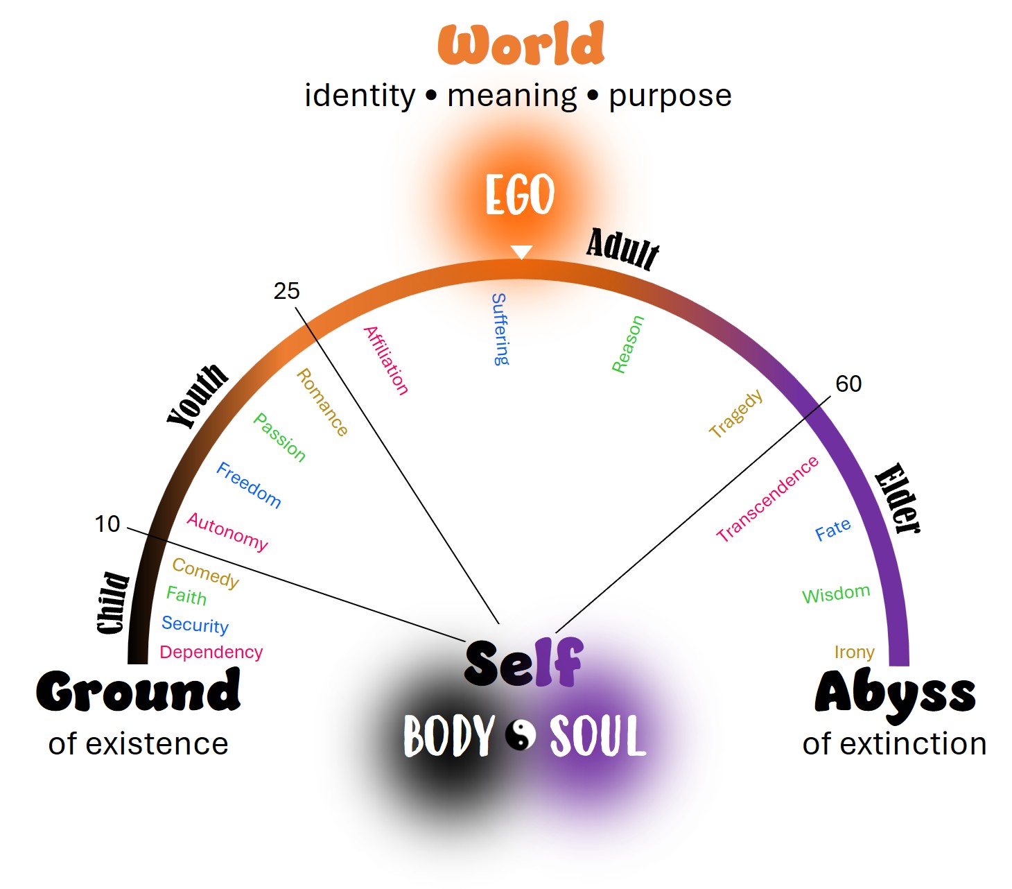 We won’t have time in this post to explore all twenty principles of the matrix in detail. It will be sufficient to gain an understanding of its organizing logic and thematic variations. What we see in the illustration above is the arc of a human lifespan, extending over time through a gradient of colors ranging from black (body-centered) to orange (ego-centered) to purple (soul-centered). Its continuum of consciousness (body-ego-soul) is further divided into four ages, represented in the mythic archetypes of the Child (birth to age 10), Youth (age 10 to 25), Adult (age 25 to 60), and Elder (age 60 to death).
