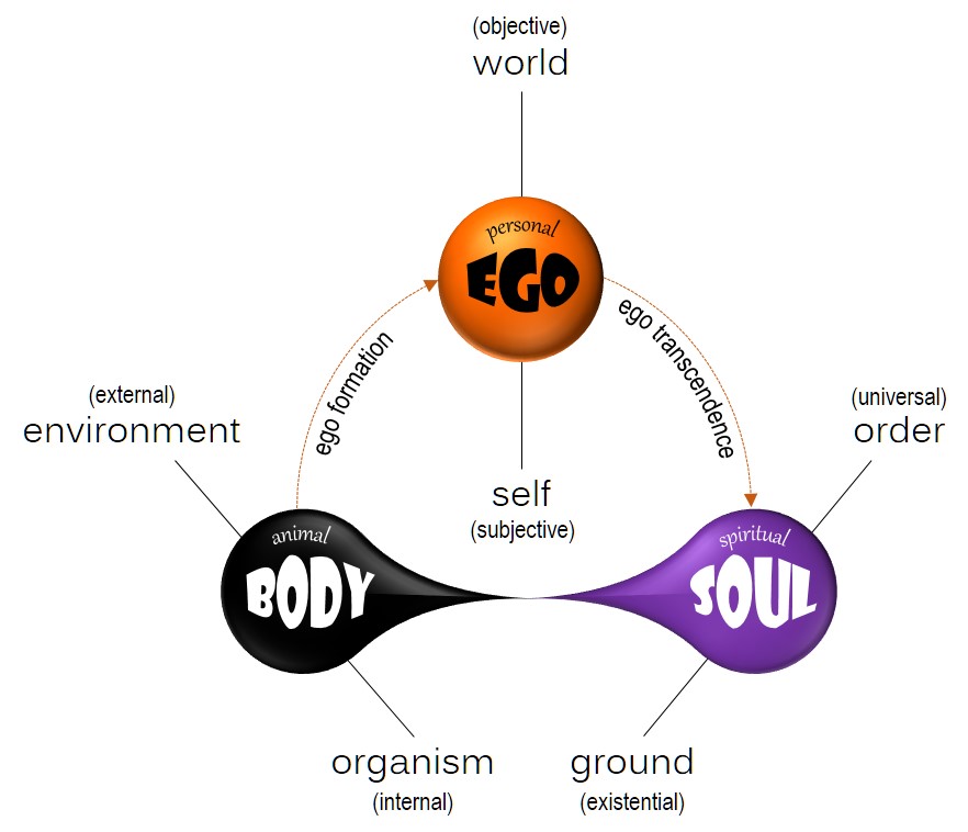 In the opposition phase, our separate center of personal identity (ego) is not very well defined. The very imposition of ego, however, causes a split in consciousness where an inner subjective realm is gradually divided from an outer objective realm, or ‘soul’ from ‘body’. Whereas soul and body in our essential nature are simply the introverted (intuitive-spiritual) and extroverted (sensory-physical) aspects of an evolved consciousness, our executive center of personal identity throws them into opposition. Now ‘I’ (ego) have a soul and a body, and the challenge becomes one of constructing a meaningful relationship between them.