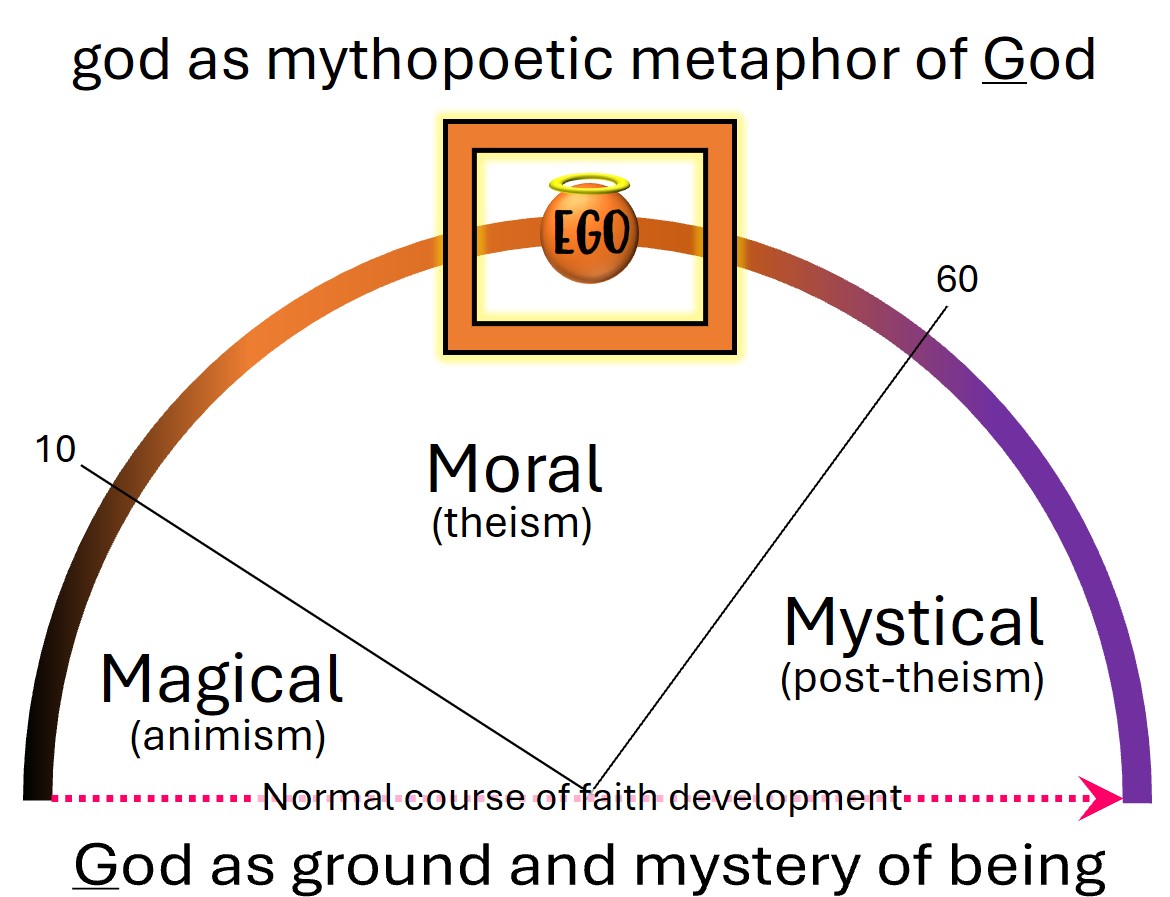 To understand (a lowercase) god as a mythopoetic metaphor of (the uppercase) God – as an imaginated form of the present Mystery – is the insight that carries faith development across the distinct frames of religion: from animism, through theism, and into a post-theistic spirituality.